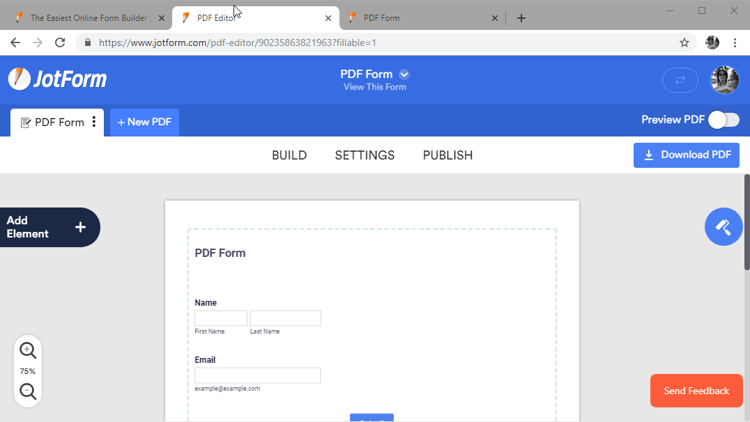 If you've been using Jotform and have web forms already built, you can create fillable PDF versions of these web forms. Following the same process explained above, instead of creating a blank PDF form, or importing one, you can use the current form loaded in your PDF EDITOR and convert it into a fillable PDF form. Just click the CREATE PDF FORM button.